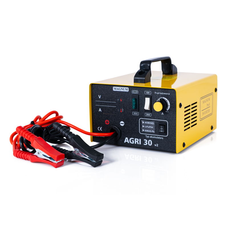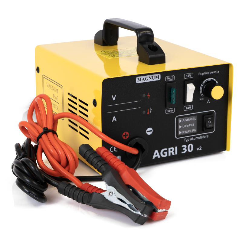 Model AGRI 30 V2 to potężne urządzenie stworzone z myślą o profesjonalnych warsztatach, rolnictwie i przemyśle. Prostownik jest w pełni kompatybilny z akumulatorami 12V i 24V. Obsługuje kluczowe typy baterii: kwasowo-ołowiowe (WET), AGM/GEL oraz LiFePO4. Co więcej, wbudowany woltomierz na bieżąco monitoruje napięcie, gwarantując pełną precyzję ładowania.