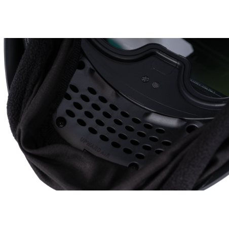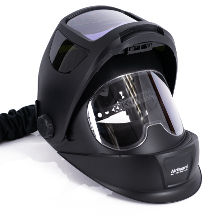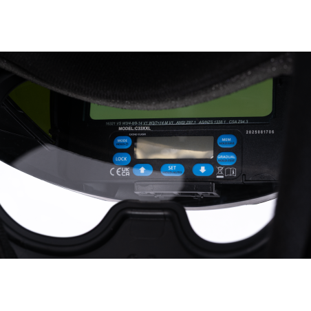W komplecie znajduje się przyłbica samościemniająca MAGNUM FS8 FLIP UP o konstrukcji umożliwiającej szybkie unoszenie części z kasetą filtra, co zapewnia bardzo duże, niezaciemnione pole widzenia w trybie podniesionym.
